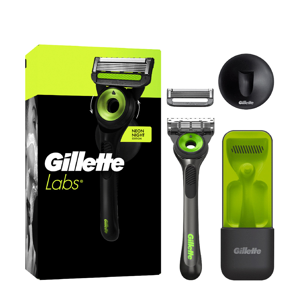Gillette Labs Neon Night is a premium razor with integrated cleaning technology. It features a modern, ergonomic design with a black finish and neon details. This set includes two cartridges and a travel case, ideal for maintaining comfort and performance anywhere.